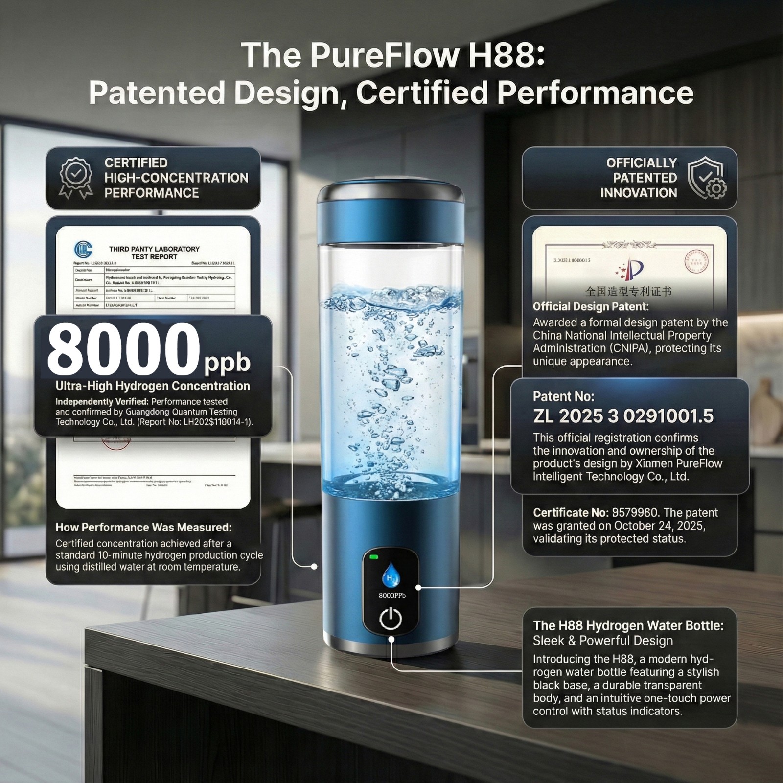Стакан для получения воды, обогащенной водородом, H-88 оснащен новейшей технологией электролиза СПЭ/ПЕМ, сочетающей платиновые электродные пластины из титана и иридиево-платиновые протонные мембраны, что обеспечивает эффективное разделение водорода и кислорода, а также безупречную чистоту получаемого водорода. Инновационный двухступенчатый режим производства водорода с возможностью выбора параметров позволяет получать воду с высокой концентрацией водорода 4000 ППБ за 5 минут, с пиком 8000 ППБ+ за 10 минут. Содержание водорода на 300% выше, чем у аналогичных продуктов, что позволяет легко получать достаточное количество водорода и укреплять здоровье.